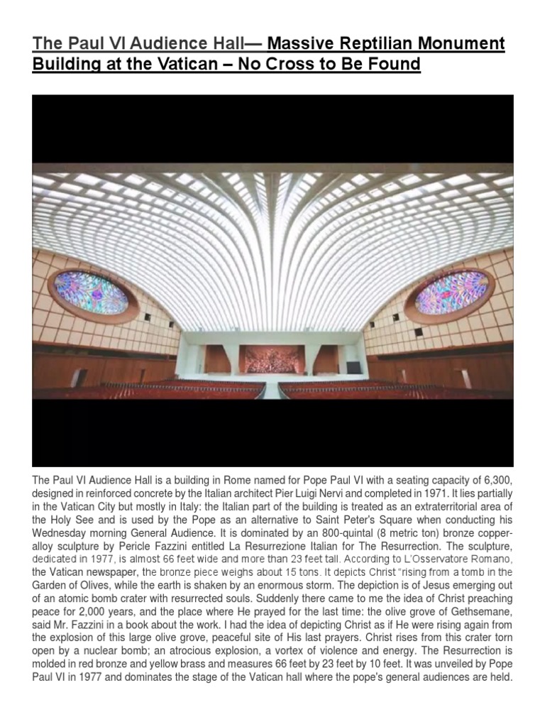 Paul Vi Audience Hall In Vatican City Evilbuildings from external-preview.redd.it It sounds as if you're referring to the large, modern artwork of the resurrected jesus, a backdrop to the pope's weekly audiences when they are held in the auditorium during inclement weather. Also known as the paul vi audience hall or the hall of the pontifical audiences, it lies partially in vatican city and partially in rome, italy. Nov 17, 2017 · also known as the paul vi audience hall or the hall of the pontifical audiences, it lies partially in vatican city and partially in rome, italy. Book a pope general audience! Oct 11, 2018 · let's start with the history and construction of the papal audience hall from arcvision prize: Shortly thereafter both the hall and the architect achieved such a worldwide fame that the auditorium came to be called familiarly aula nervi. What was the name of pope paul vi's audience hall? Inside, on the stage behind the seated "pope" is a massive artwork allegedly depicting the resurrection of christ.